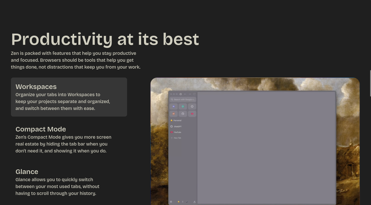Zen is packed with features that help you stay productive and focused. Browsers should be tools that help you get things done, not distractions that keep you from your work.